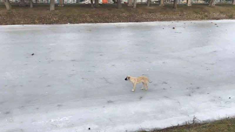 Eskişehir’de buz tutan Porsuk Çayı’nın üzerinde gezintiye çıkan sokak köpeği dikkat çekti.