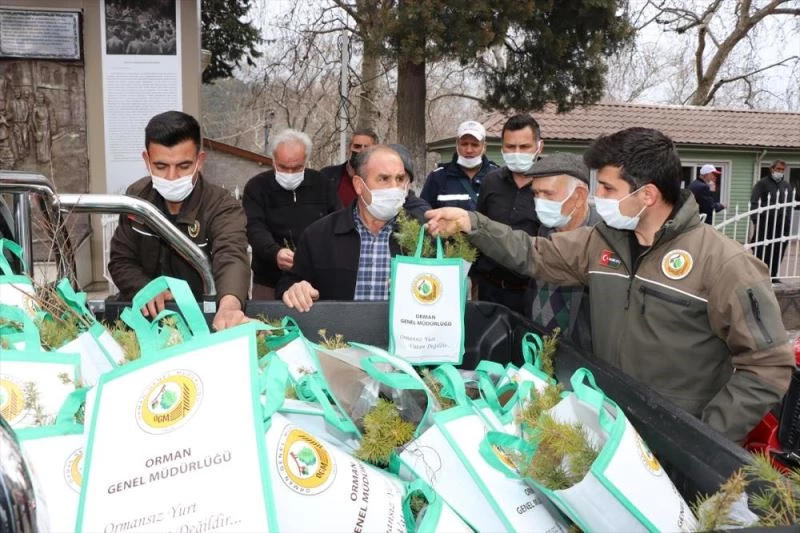 Merkez Cami önündeki dağıtım töreninde vatandaşlara ceviz, badem ve sedir fidanları verildi.