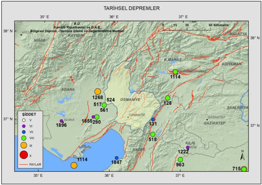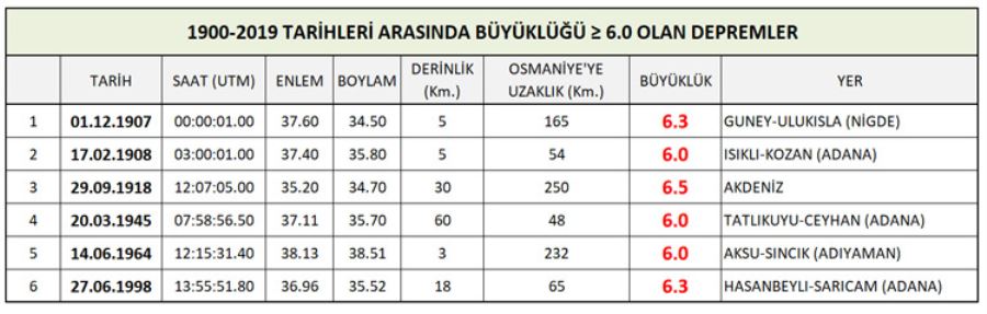 Tarihsel dönemde (M.Ö. 1800-M.S. 1900; Soysal ve diğ., 1981) genelde Doğu Anadolu Fay Zonu’nun ve Düziçi-iskenderun Fay Zonu’nun etkisinden dolayı bölgede şiddet değeri Io=IX olan 1114 ve 1268 depremleri meydana gelmiştir. Ayrıca Osmaniye ili sınırlarının batı