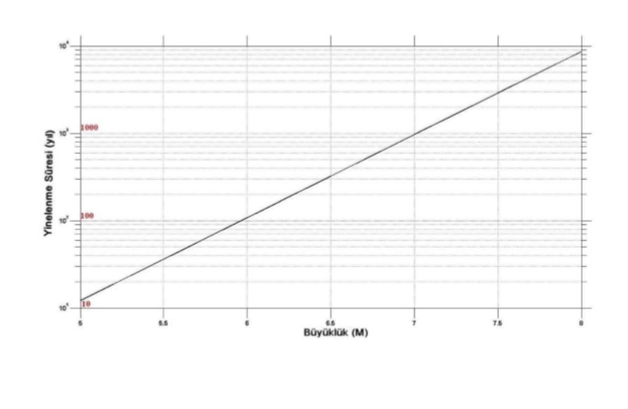 M=5.0 için ortalama her 13 yılda bir, M=5.5 her 38 yılda bir, M=6.0 için yaklaşık her 100 yılda bir, M=6.5 için yakşalık her 300 yılda bir, büyüklüğü M=7.0 için olma olasılığı yaklaşık her 1000 yılda bir olarak değerlendirilmiştir.