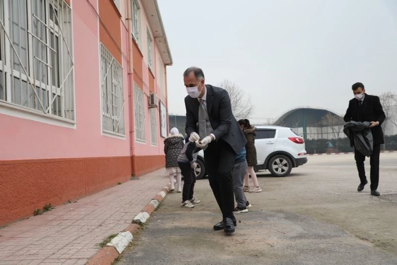 Bursa’nın İnegöl Kaymakamı Eren Arslan ve Belediye Başkanı Alper Taban, 100. Yıl İlkokulu öğrencileriyle birlikte okul bahçesinde çevre temizliği yaptı.