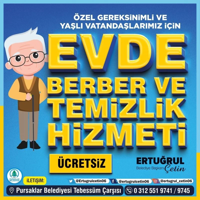 Pursaklar Belediyesi Sosyal Yardım İşleri Müdürlüğü tarafından oluşturulan ekip, vatandaşlara yardım elini uzatarak, berber bakımından ev temizliğine kadar birçok hizmetle yaşlı ve yatalak konumdaki ihtiyaç sahiplerinin ihtiyaçlarını karşılayacak. Evde Berber ve Temizlik Hizmetinden yararlanmak isteyen vatandaşlar, Pursaklar Belediyesine ulaşarak bilgi alabilecek.