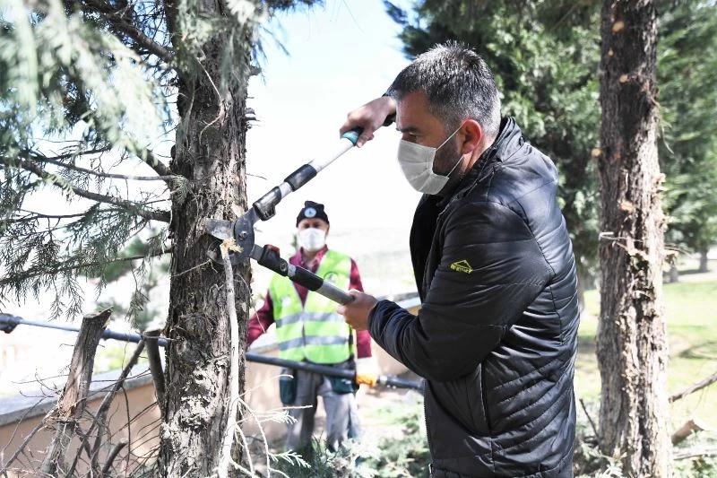 Yaz aylarının vazgeçilmez mekânları olan park ve bahçelerde havaların ısınmasıyla birlikte çalışmalara hız verildi. Pursaklar Belediyesi, ilçe genelinde virüsle mücadelede dezenfekte çalışmalarını tüm yoğunluğuyla sürdürürken, diğer taraftan da vatandaşların dinlendiği ve nefes aldığı park ve yeşil alanlarda yapılan peyzaj düzenleme çalışmalarıyla sosyal alanları yaza hazırlıyor. Park ve bahçelerde yapılan çalışmalar hakkında ekiplerden bilgi alan Başkan Ertuğrul Çetin, makası eline alarak ağaçların dallarını tek tek budadı.