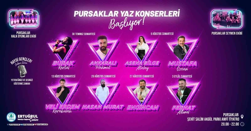 Pursaklar Belediyesi Şehit Salim Akgül Parkı Amfi Tiyatrosunda gerçekleştirilecek olan etkinliklerde; Burak Kartal, Ankaralı Mahmut, Asena Bilge, Mustafa Özcan, Veli Erdem Karakülah, Hasan Murat, Engincan, Ferhan Altınel gibi ünlü sanatçılar ve Pursaklar Halk Oyunları Ekibi, Pursaklar Seymen Ekibi sahne alacak. Yetenekli gençlere de fırsat sunacak Pursaklar Belediyesi, sesine güvenenlere de sahneye çıkma imkanı sunacak.