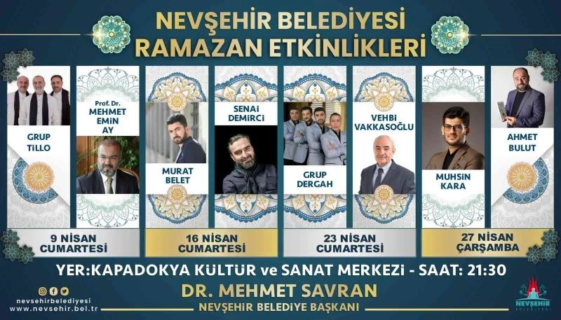 Vatandaşların ramazan ayının manevi atmosferini gönüllerince yaşamalarına katkı sağlamak için gerçekleştirilecek olan etkinlikler ramazan ayı süresince Kapadokya Kültür ve Sanat Merkezi’nde yapılacak. Etkinlikler saat 21.30’da başlayacak ve Nevşehir Belediyesi’nin web tv kanalı olan tvnev’in sosyal medya hesaplarından da canlı olarak yayınlanacak. İlki 9 Nisan Cumartesi akşamı gerçekleştirilecek olan etkinlikte Grup Tillo sahne alacak ve seslendireceği ilahilerle katılımcılara doyumsuz bir gece yaşatacak. Grup Tillo’nun ardından ise İlahiyatçı, Müzisyen Prof. Dr. Mehmet Emin Ay konferans verecek. 6 Nisan Cumartesi akşamı ise; deneme, araştırma, öykü ve günlük yazan, televizyon ve radyo programları yapan Psikoterapist Senai Demirci ile ilahi sanatçısı Murat Belet Kapadokya Kültür ve Sanat Merkezi’nde olacak. Ramazan ayı boyunca Türkiye’nin önemli sanatçı ve yazarlarını Nevşehirlilerle buluşturacak olan Nevşehir Belediyesi, 23 Nisan Cumartesi akşamki etkinliklerinde ise Vehbi Vakkasoğlu’nu konuk edecek. Eğitimci, Yazar Vehbi Vakkasoğlu’nun doyumsuz sohbeti ile birlikte Grup Dergah seslendireceği ilahilerle katılımcılar keyifli bir vakit geçirecek.