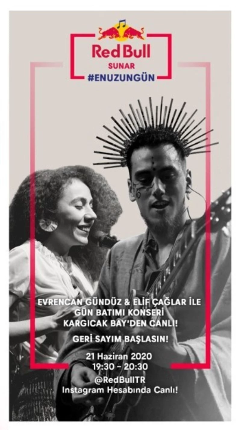 Oluşturduğu müzikal programlarla özgün deneyimlere imza atan Red Bull, blues müziğin sevilen ismi Evrencan Gündüz ile Türkiye’nin en sevilen caz solistlerinden Elif Çağlar’ın performansı ile güneşi batırıyor. Mesafeleri yakın eden, dünyanın uzak köşelerinden aslında sanıldığı kadar uzak olmadığımızı gösteren Red Bull Sunar: En Uzun Gün (#EnUzunGun) canlı konserinde ikili, Red Bull Türkiye Instagram hesabını ele geçirecek. Sanatçılar saat 19.30’da Kargıcak’taki deniz manzarasını arkasına alarak en sevilen şarkılarını hiç bitmeyen enerjisi ile seslendirecek. Red Bull ile #enuzungün’e ait detaylar Red Bull Türkiye instagram hesabında ve RedBull.com adresinde olacak.