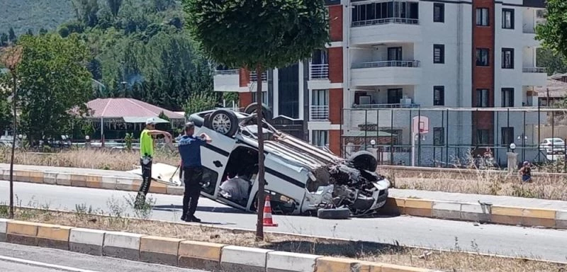Tokat’ta refüje çarparak devrilen hafif ticari araçtaki 2 kişi kazayı yaralı olarak atlattı.
