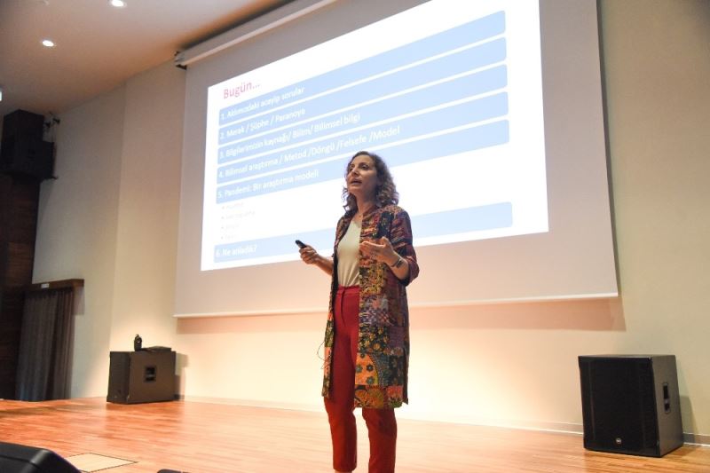 Bilimsel bilginin; tarafsızlık, doğru ölçü, kanıtlama ve genelleyici olma gibi özellikleri olduğunu belirten Prof. Dr. Çakar, “Aklımızdaki Acayip Sorular, Şüphe, Paranoya, Bilimsel Bilginin Kaynağı, Bilimsel Araştırma Metodu, Pandemi: Bir Araşatırma Modeli” başlıklarında bilgiler aktardı. Bilimsel araştırma modelinin nasıl oluşturulması gerektiğiyle ilgili geçmiş ve günümüzden örnekler veren Rektör Prof. Dr. Nigar Demircan Çakar, Covid-19 sürecinde akla gelen sorulardan yola çıkarak bilimsel araştırma modelinin aşamalarını katılımcılarla paylaştı.