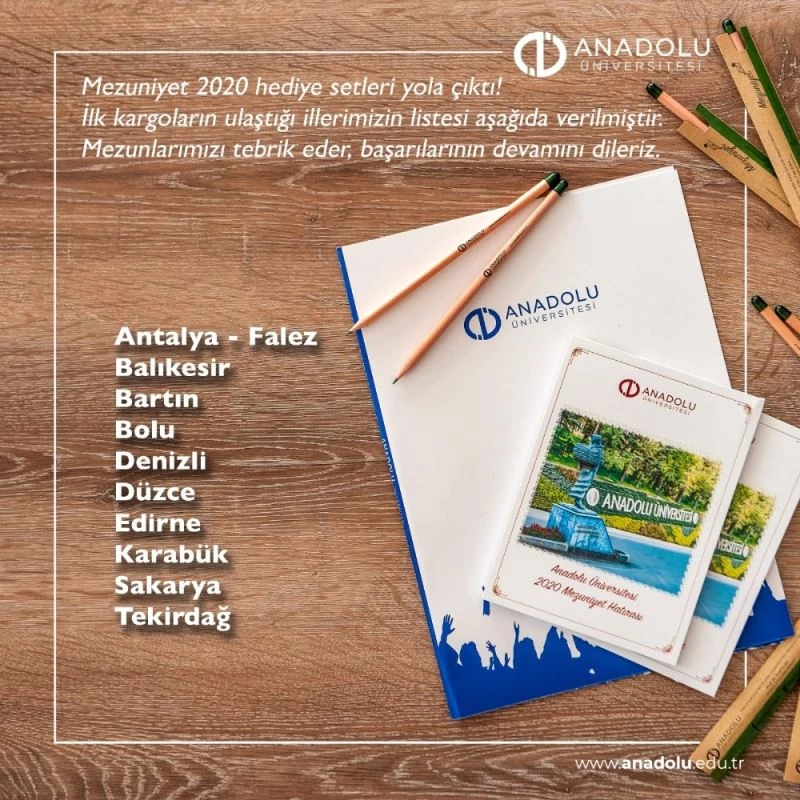 Anadolu Üniversitesi Rektörü Prof. Dr. Fuat Erdal’ın açıkladığı ve Anadolu Üniversitesi 2019-2020 Akademik Yılı mezunlarına verilecek olan mezun hediye paketi dağıtımları başlıyor.