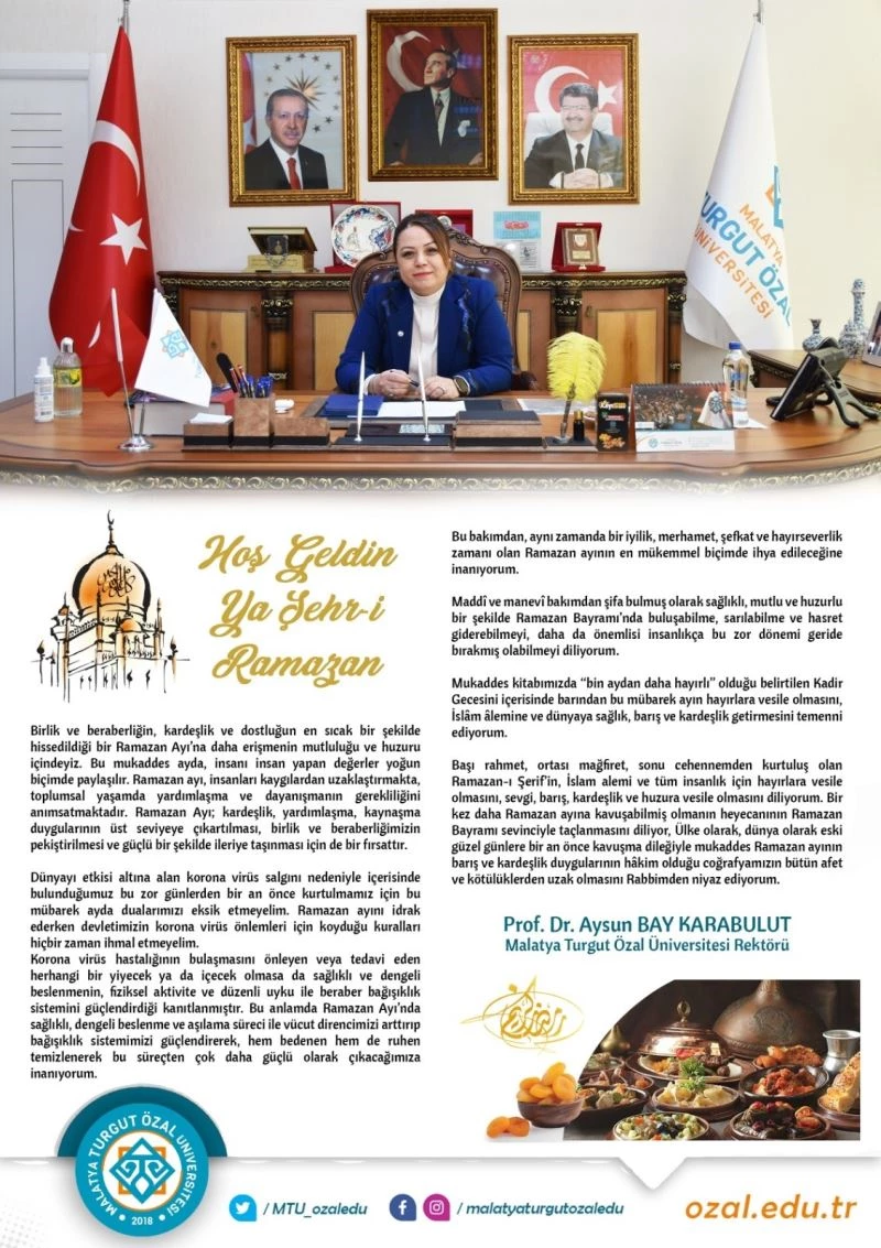 Malatya Turgut Özal Üniversitesi (MTÜ) Rektörü Prof. Dr. Aysun Bay Karabulut, Ramazan Ayı mesajında, Ramazan Ayı’nın iyi değerlendirilmesini önerdi.