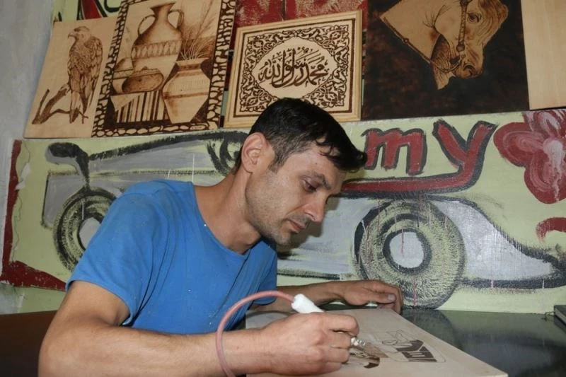 Bir taraftan kazalı araçların kaportaları ile uğraşan Kazım Yeşilada, işinden arta kalan zamanlarda ise kendi dünyasında oluşturduğu küçük atölyesinde karakalem, yağlıboya ve hiçbir eğitim almadan yakma tekniğini kullanarak birbirinden güzel tablolar çiziyor. Çocukluğundan beri resme olan ilgisini büyüdüğünde de hiç kaybetmediğini ifade eden Kazım Yeşilada, Bitlis Halk Eğitim Müdürlüğü bünyesinde açılan karakalem kursuna 2 yıl boyunca giderek eğitim aldı. Atölyesinde birçok resmi bulunan Yeşilada’nın müşterileri de bir taraftan araçlarının tamirini beklerken, diğer taraftan duvarları süsleyen tabloları izliyor. Hedefinin ilerleyen zamanlarda Güzel Sanatlar Fakültesi okumak olduğunu belirten Yeşilada, “14 yaşından beri kaportacılık yapıyorum. Daha önceden resme karşı bir hayalim vardı. Sonradan bir heves sardı beni. Ressam olmak istedim. Ancak imkanlar elvermediği için kaportacılık yaptım. Bende bu atölyede kendime göre hobi olarak resim yapmaya başladım. Önce karakalem ile başladım. Daha sonra yağlı boya tabloları ile ardından da kendime ait ahşap yakma tekniği denemeye başladım. 2 yıl boyunca karakalem ve yağlıboya tablo kursuna giderek eğitim aldım. Özellikle kış aylarında ve kaportacılıktan arta kalan boş zamanlarımda yapıyorum. Kaportacılık zor bir iştir. Stresli bir iştir. Bütün bu stresin içinden sıyrılmak için yukarı atölyeme çıkıp resim yapıyorum. Bu benim stresimi de alıyor. Bu konu ile ilgili lise diplomamı alıp, üniversite de Güzel Sanatlar Fakültesi okumak istiyorum. Pandemi dolayısıyla yaptığım resimleri şimdilik iş yerimde sergiliyorum. Ancak normal bir döneme geçersek, sergi açmayı da istiyorum. Karakalem çalışmalarında genelde portre çalışıyorum. Bu konuda çok istek geldiği için karakalemi bırakıp ahşap yakma tekniğine geçtim. Bazı müşterilerimiz tablolarımızı görüp satın almak istiyor. Ancak ben bugüne kadar yaptıklarımı hiç satmadım” diye konuştu.