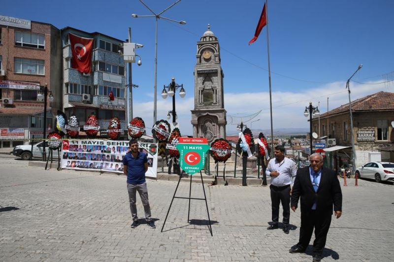 Reyhanli Kaymakami Ali Candan, AK Parti Hatay Milletvekili Hüseyin Sanverdi, CHP Hatay Milletvekili Ismet Tokdemir ve saldirilarda hayatini kaybedenlerin yakinlari, 11 Mayis Sehitler Aniti önünde bir araya geldi.