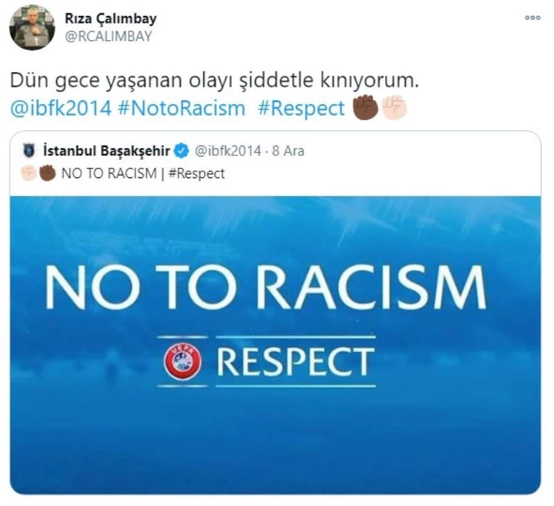 Bu olayın ardından Başakşehir’e her yerden destekler gelirken, bir destek mesajı da Sivasspor Teknik Direktörü Rıza Çalımbay paylaştı. Çalımbay, sosyal medya hesabındaki mesajında, “Dün gece yaşanan olayı şiddetle kınıyorum. No to racism! Respect!” yazdı.