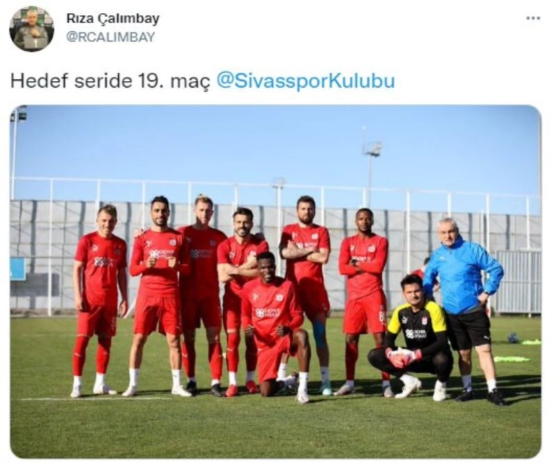 Rakibini kazanması halinde Avrupa hedefine yaklaşacak olan Sivasspor’da tek hedef galibiyet. Kritik mücadele öncesi Sivasspor Teknik Direktörü Rıza Çalımbay’dan iddialı bir paylaşım geldi. Çalımbay, antrenman sonrası kazanan takım ile beraber çektirdiği fotoğrafı paylaşarak, "Hedef seride 19. maç" notunu ekledi.