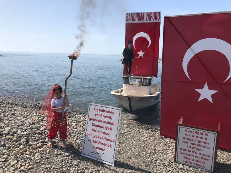 Rize’nin Ardeşen ilçesine bağlı Konaktepe Mahallesi’nde sıra dışı bir 19 Mayıs kutlaması yapıldı. Bir yakınına ait balıkçı teknesini Atatürk’ün Samsun’a çıktığı Bandırma Vapuru olarak hazırlatan 8 yaşındaki Tuğçe Yakıcı, tekne üzerinde horon müziği eşliğinde kıyıya doğru geldi. Tekneden meşaleler ile inen ve bu esnada temsili Atatürk heykeline dönen minik Tuğçe “Atam, Milletin bağımsızlığını yine milletin azmi ve kararlığı kurtaracaktır. 19 Mayıs 1919’da Kurtuluş Savaşı’nı başlattın” sözleri ile Gençlik ve Spor Bayramı’nı kutladı ve bir şiir okudu.