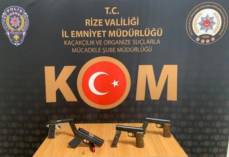 Alınan bilgiye göre, Rize İl Emniyet Müdürlüğüne bağlı Kaçakçılık ve Organize Suçlarla Mücadele Şube ekiplerince durdurulan bir araçta arama yapıldı. Aramalar neticesinde araçta gizlenmiş 4 adet el yapımı tabanca ele geçirildi. Tabancalara el konulurken, gözaltına alınan C.K. ve C.Ş. isimli şahıslar hakkında adli işlem yapıldı.