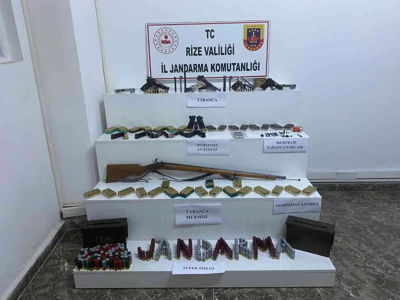 Rize İl Jandarma Komutanlığına bağlı ekiplerce Fındıklı ilçesine bağlı Derbent köyünde yaşayan Ö.L.K. isimli şahsın ikametinde yapılan aramalar neticesinde, 3 adet 9 milimetre çapında ruhsatsız tabanca, 1 adet 7.65 milimetre çapında ruhsatsız tabanca olmak üzere toplam 4 adet ruhsatsız tabanca, 17 adet tabanca şarjörü, bin 606 adet 9 milimetre, 56 adet 7.65 milimetre çapında tabanca mermisi olmak üzere toplam bin 662 adet tabanca mermisi, 2 adet el yapımı olduğu değerlendirilen tabanca üst kapağı, 6 adet tabanca namlusu, 21 adet tabanca yapımında kullanıldığı değerlendirilen silah parçası (iğne, yay, ateşleme çekici, tetik, üst kapak tutucu pim, 3 adet tabanca kabze kapağı, 2 adet makinalı tüfek için kullanılan boş mayon kutusu, 1 adet üzerinde 1933 ibaresi yazılı namludan doldurma ruhsatsız av tüfeği, 218 adet av tüfeği fişeği ele geçirildi. Geçirilen suç aletlerine el konulurken Ö.L.K. isimli şahıs gözaltına alındı.