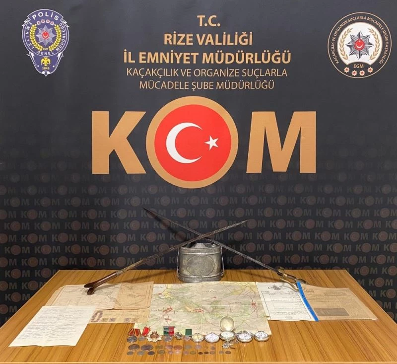 Rize İl Emniyet Müdürlüğüne bağlı KOM Şube Müdürlüğü ekiplerinin çalışmaları kapsamında yasadışı yollardan tarihi eser temin ettiği ve ticaretini yaptığı tespit edilen bir şahıs gözaltına alındı. Şahsın evinde gerçekleştirilen aramada, 17. veya 18. yüzyıl yapımı 1 adet kılıç, tarihi eser niteliğinde metal kap, farklı dönemlere ait 3 adet madalyon, 2. Mahmut Dönemi’ne ait sikke ve Abdülmecid Dönemi’ne ait 2 adet sikke ele geçirildi. Konuyla ilgili İl Emniyet Müdürlüğünün çalışmaları devam ediyor.