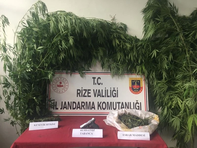 Rize İl Jandarma Komutanlığı tarafından yapılan operasyonla 21 kök kenevir bitkisi, bin 708 gram esrarın yanı sıra bir de ruhsatsız silah ele geçirildi.