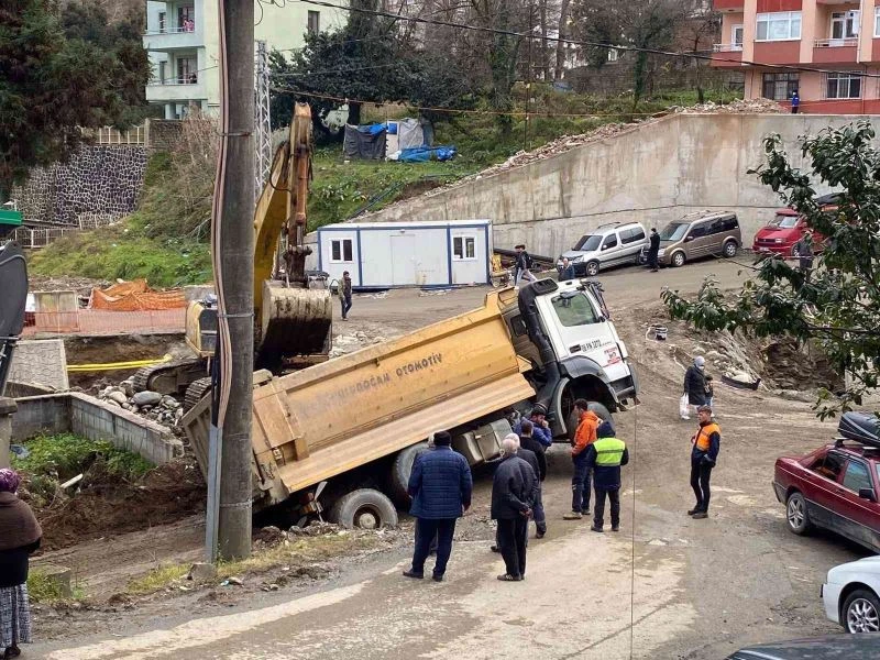 Rize’de derenin üzerinden geçen yol çökünce taş kamyonu içerisine düştü.