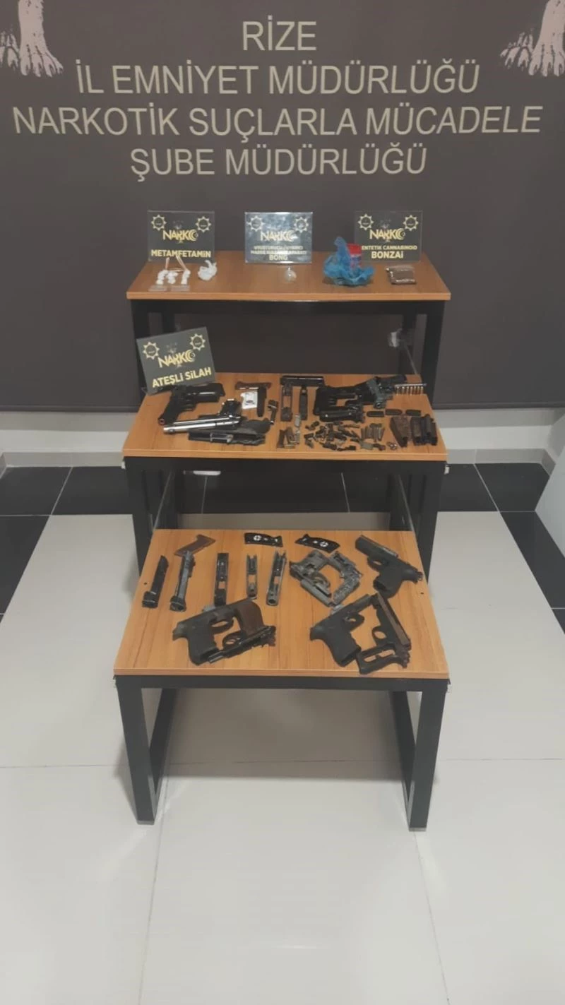 İl Emniyet Müdürlüğü Narkotik Suçlarla Mücadele Şube Müdürlüğü tarından Rize genelinde uyuşturucu ve uyarıcı madde ticareti yapan şahıs ve gruplara yönelik yürütülen çalışmalar kapsamında uyuşturucu ve uyarıcı madde ticareti yaptığı değerlendirilen A.A., M.K. ve M.D. isimli şahısların ikametlerinde ve araçlarında arama yapıldı. Yapılan aramada 18 parça satışa hazır halde toplam ağırlığı 27,58 gram metamfetamin maddesi, 3 parça satışa hazır halde toplam ağırlığı 63,97 gram bonzai, 1 parça 5,23 gram bonzai hammaddesi, 1 adet uyuşturucu kullanım aparatı, 3 adet kurusıkı tabanca, 1 adet ruhsatsız tabanca, 59 adet tabanca fişeği, 8 adet tabanca üst sürgü kapağı, 9 adet tabanca gövdesi, 50 adet tabanca yapım ve donarım için kullanılan muhtelif silah parçaları ele geçirildi.