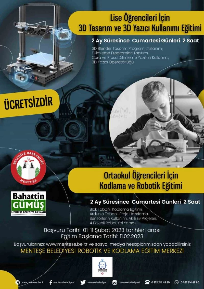 Menteşe Belediyesi tarafından yapılan açıklamada eğitimlerin 11 Şubat 2023 tarihinde başlayacağı belirtilerek şu ifadelere yer verildi: “Menteşe Belediyesi robotik ve kodlama eğitimlerinde Lise öğrencileri’ için 3D tasarım ve 3D yazıcı kullanımı eğitimi verilecek. İki ay süresince Cumartesi günleri 2 saat verilecek eğitimlerde, 3D Blender tasarım programı kullanımı, dilimleme programları tanıtımı, Cura ve Prusa dilimleme yazılımı kullanımı ve 3D yazıcı operatörlüğü eğitimleri verilecek. Ortaokul öğrencilerine yönelik kodlama ve robotik eğitimi çerçevesinde blok tabanlı kodlama eğitimi, ardunio tabanlı proje hazırlama, sensörlerin kullanımı, akıllı ev projeleri ve 4 eksenli robot kol yapımı eğitimleri verilecek. Ortaokul öğrencilerine verilecek eğitimlerde yine iki ay sürecek ve Cumartesi günleri 2 saat verilecek”