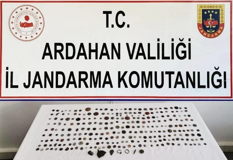 Ardahan’da jandarma ekiplerince durdurulan otobüste bir yolcunun çantasında yapılan aramada, 269 sikke ve 7 adet tarihi obje ele geçirildi.