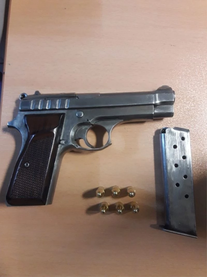 Yakalanan şahısların üzerlerinde yapılan aramalarda 9 mm çapında üzerinde herhangi bir ibare bulunmayan ruhsatsız tabanca ve tabancaya takılı şarjöre basılı halde 6 adet 9 mm çaplı mermi ele geçirildi.