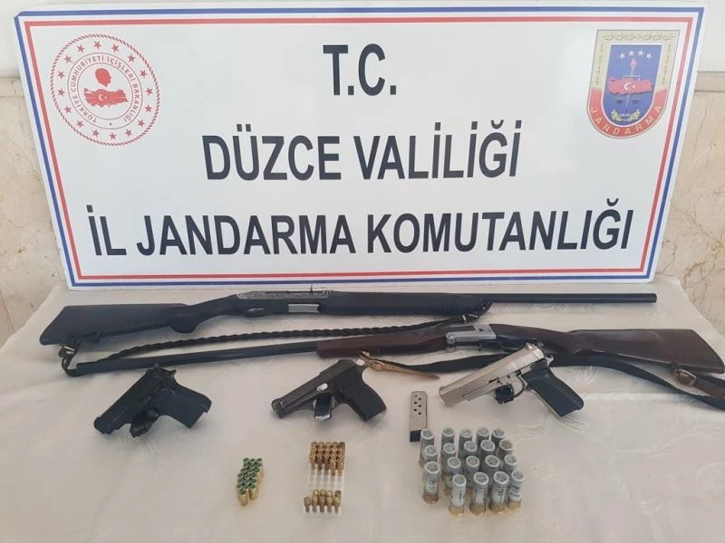 DÜZCE – Düzce’de jandarma ekipleri bir şahsın ikametinde ruhsatsız tabanca, tüfek ve mermiler olduğu ihbarı üzerine yaptığı aramada, ikisi kurusıkı 3 tabanca ve 2 ruhsatsız av tüfeği ele geçirdi.