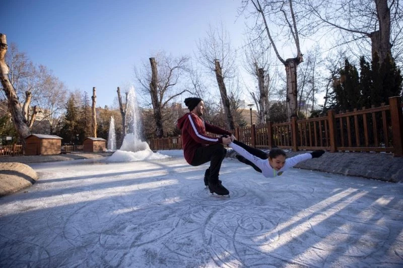Başkent’te soğuktan dolayı buz tutan Ankara’nın simgelerinden Kuğulu Park, buz pateni antrenörü Türker Turhan ve öğrencilerine ev sahipliği yaptı. Ortaya Rusya’da, Kanada’da rastlanan görüntüler çıktı.
