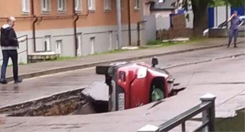 Rusya’da Kaliningrad kentinde bir caddede ilerleyen araç, bir anda asfaltın çökmesiyle açılan çukura düştü. Sürücüyü çevredekiler kurtardı.
