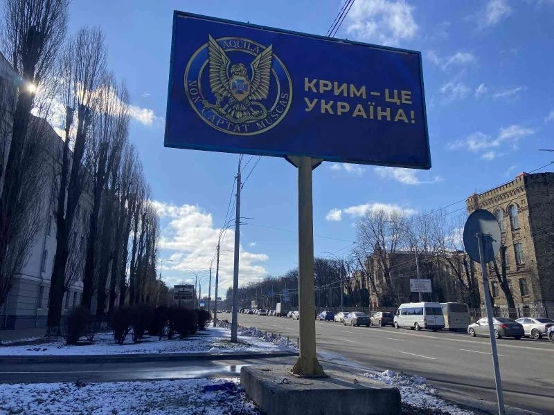 Rusya’nın Ukrayna Büyükelçiliği önündeki reklam panolarına, “Kırım Ukrayna’dır” afişleri asıldı.