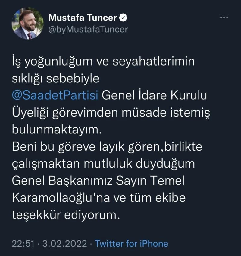 İş adamı Mustafa Tuncer, Saadet Partisi’nden istifa etti.