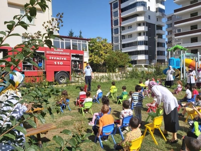Samsun Büyükşehir Belediyesi İtfaiye Daire Başkanlığı ekipleri anaokulu öğrencilerine yönelik yangına karşı farkındalık eğitimi veriyor.