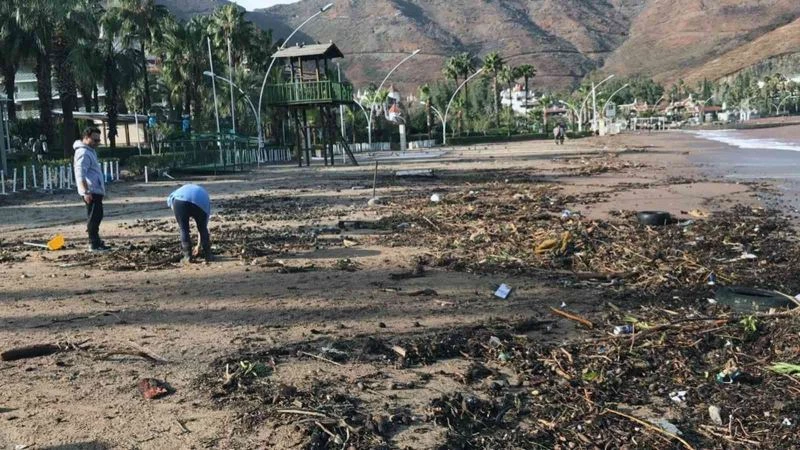 Sağanak sonrası İçmeler sahili ağaç parçalarıyla doldu