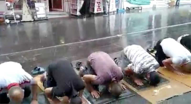 Ağrı’da Cuma namazı esnasında sağanak yağmura yakalanan cemaat, namazı terk etmedi.