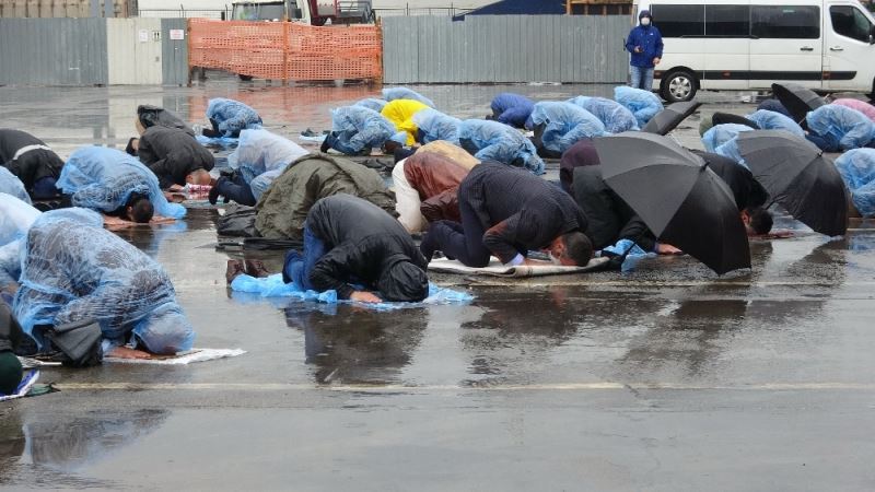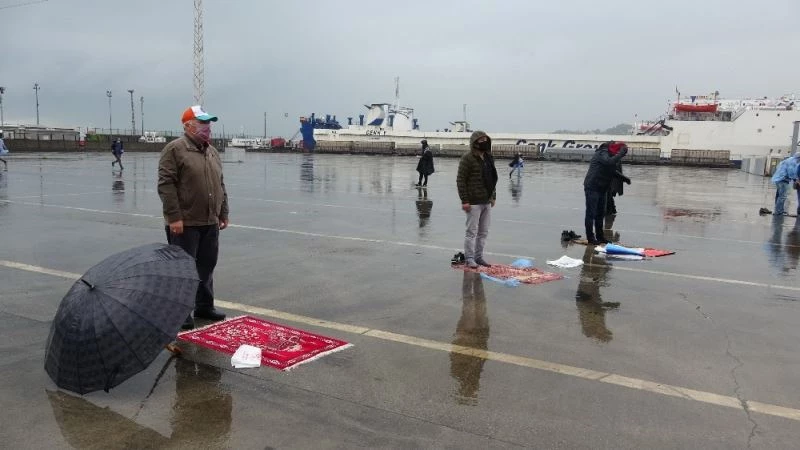 Zonguldak’ta vatandaşlar şiddetli yağmura rağmen limanda Cuma namazı kıldı.