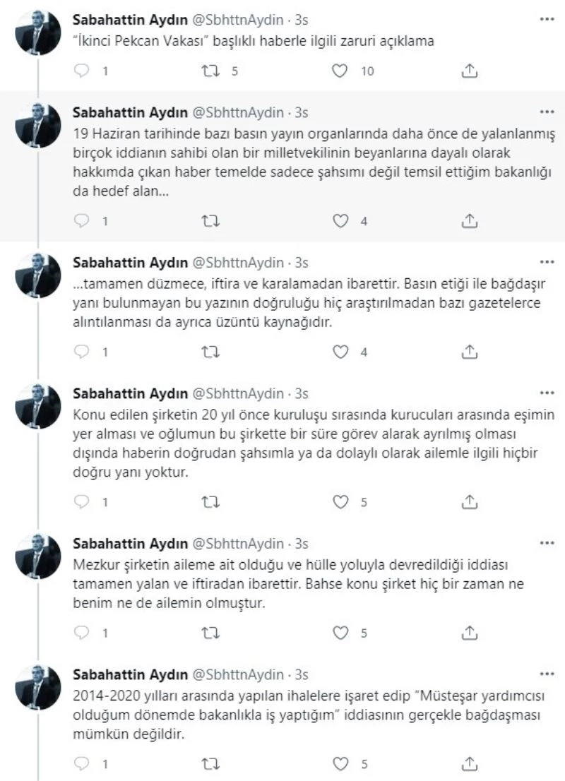 Konu edilen şirketin 20 yıl önce kuruluşu sırasında kurucuları arasında eşimin yer alması ve oğlumun bu şirkette bir süre görev alarak ayrılmış olması dışında, haberin doğrudan şahsımla ya da dolaylı olarak ailemle ilgili hiçbir doğru yanı yoktur. Mezkur şirketin aileme ait olduğu ve hülle yoluyla devredildiği iddiası tamamen yalan ve iftiradan ibarettir. Bahse konu şirket hiçbir zaman ne benim ne de ailemin olmuştur. 2014-2020 yılları arasında yapılan ihalelere işaret edip ‘Müsteşar yardımcısı olduğum dönemde bakanlıkla iş yaptığım’ iddiasının gerçekle bağdaşması mümkün değildir. Zira herhangi bir şirketin ortağı olmadığım gibi bu tarihlerde müsteşar yardımcısı görevinde de değildim.