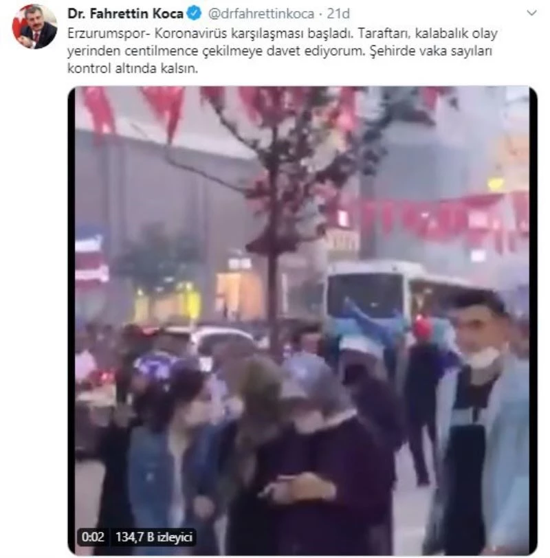 Sağlık Bakanı Koca, sosyal medyadan taraftarın galibiyet coşkusunu yaşadığı videoyu paylaşarak, “Erzurumspor- Koronavirüs karşılaşması başladı. Taraftarı, kalabalık olay yerinden centilmence çekilmeye davet ediyorum. Şehirde vaka sayıları kontrol altında kalsın” uyarılarında bulundu.