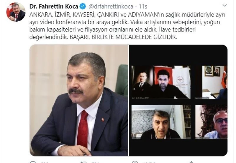 Sağlık Bakanı Fahrettin Koca, gece yarısı yapılan toplantıda Ankara, İzmir, Kayseri, Çankırı ve Adıyaman İl Sağlık Müdürleri ile video konferans yöntemi ile pandemi sürecini değerlendirdi.