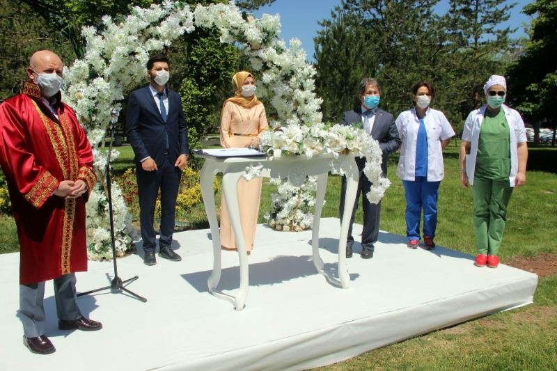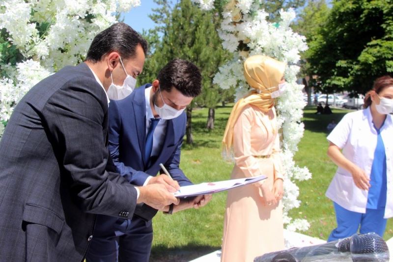 Pandemi Hastanesinde görevli sağlık çalışanı Reyhan Oral ile kendisi gibi sağlık çalışanı olan Muhlis Gençay’ın nikahı, sosyal mesafeye ve maske kurallarına uyularak İl Sağlık Müdürü Doç. Dr. Ali Ramazan Benli şahitliğinde Kocasinan Belediye Başkanı Ahmet Çolakbayrakdar tarafından kıyıldı.