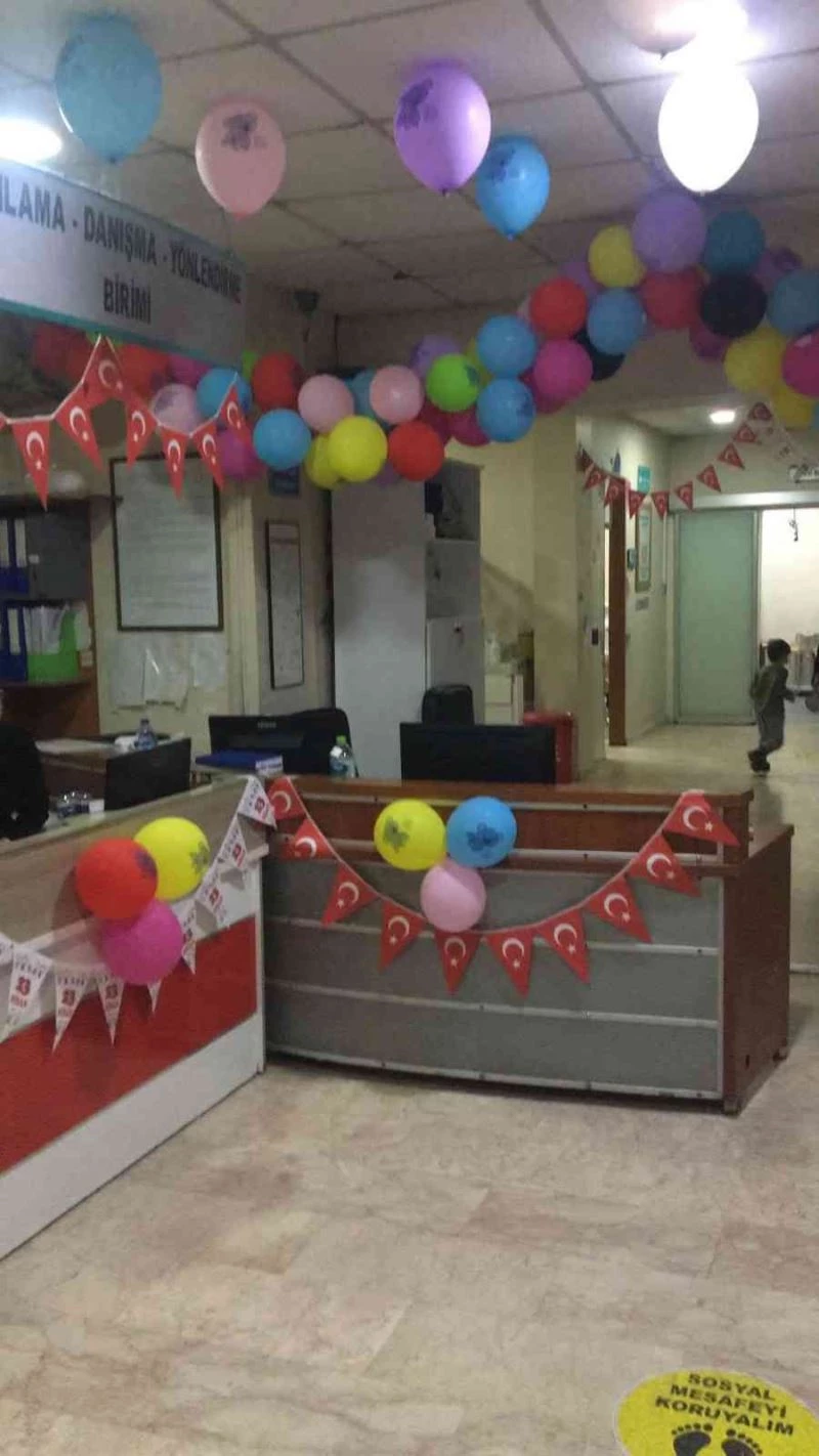 Sağlık personelleri 23 Nisan Ulusal Egemenlik ve Çocuk Bayramı doğrultusunda çocuklar için hastaneyi balon ve bayraklarla süsledi.