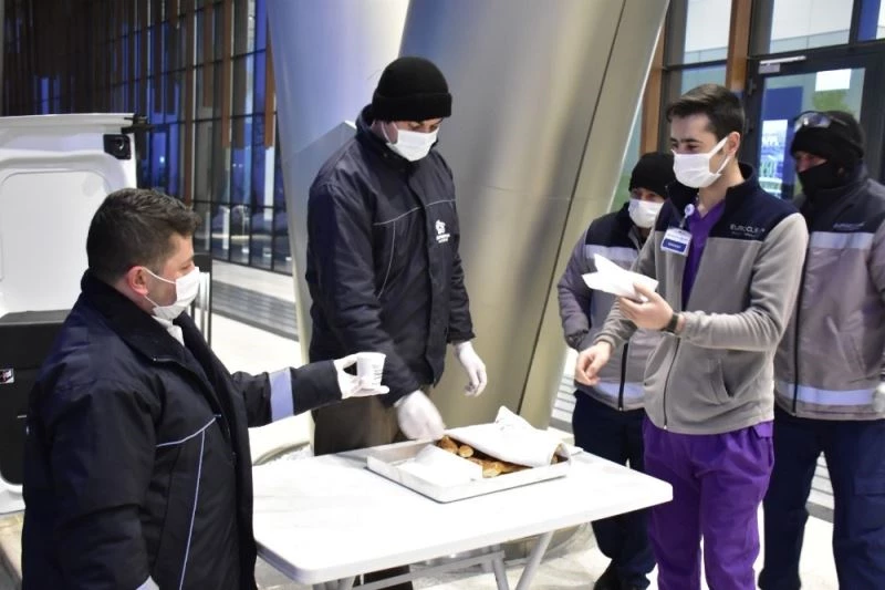 İkram edilen sıcak çorba ve simitlerden alan sağlık çalışanları, bu hizmetten dolayı belediye ekiplerine teşekkür ettiler.