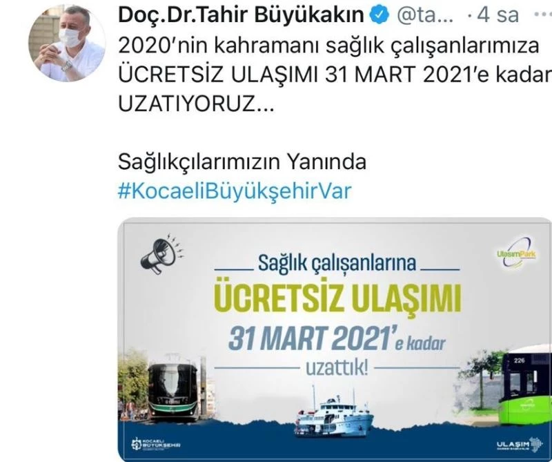 Kocaeli Büyükşehir Belediyesi, salgının ilk günlerinden beri sağlık çalışanlarına yönelik hizmetlerini sürdürüyor. Bir kahraman gibi vatandaşlara hizmet veren sağlık çalışanlarının ücretsiz ulaşımları 31 Mart 2021 tarihine kadar uzatıldı. Büyükşehir Belediye Başkanı Tahir Büyüakın alınan kararı yayınladığı sosyal medyadaki mesajıyla duyurdu. Başkan Büyükakın mesajında, “2020’nin kahramanları sağlık çalışanlarımıza ücretsiz ulaşımı 31 Mart 2021’e kadar uzatıyoruz” ifadelerine yer verdi.