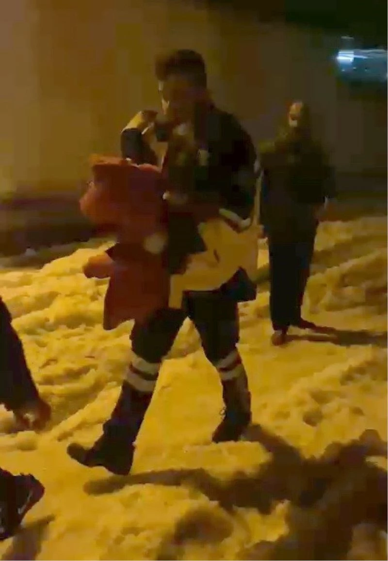 Adıyaman’ın Kahta ilçesinde bir sağlık personelli karlı sokağa ambulans giremeyince hastayı kucağında taşıdı.