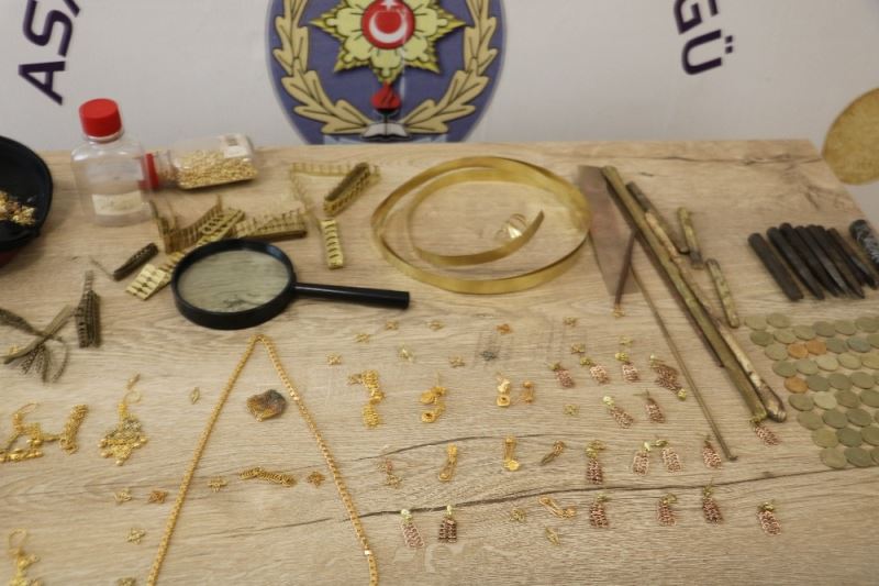 Yapılan aramada çok sayıda döküm mühür kalıbı, zincir kolye, ağırlık olarak kullanılan madeni paralar, büyüteç, altın parçaları, altın görünümlü tanecikler, numaratör, metal çubuklar, yassı plaklar ele geçirildi.