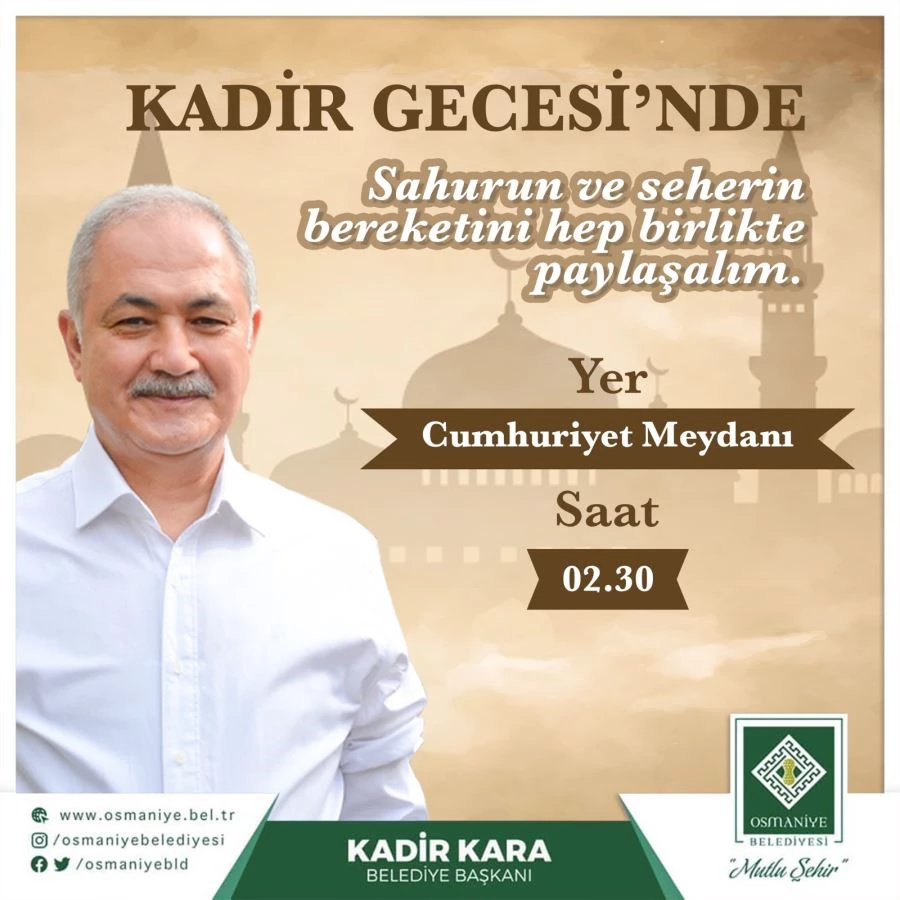 Osmaniye Belediye Başkanı Kadir Kara, her yıl olduğu gibi bu yılda sahur soframızda değerli hemşerilerimizle bir araya geliyoruz. 27 Nisan Çarşamba gününü 28 Nisan Perşembeye bağlayan gece saat 02.30’da Cumhuriyet Meydanında düzenleyeceğimiz sahur programına tüm Osmaniyeli hemşerilerimizi davet ediyoruz. Sahurun ve seherin bereketini birlikte paylaşalım. Mübarek Kadir Gecesini sahur programında okunacak Kuran-ı Kerim tilaveti ve okunacak dualarla taçlandıralım inşallah. Değerli hemşerilerim, sizlerle soframızı paylaşmak ve her zaman sizlerle birlikte olmaktan onur duyarız.” İfadelerini kullandı.