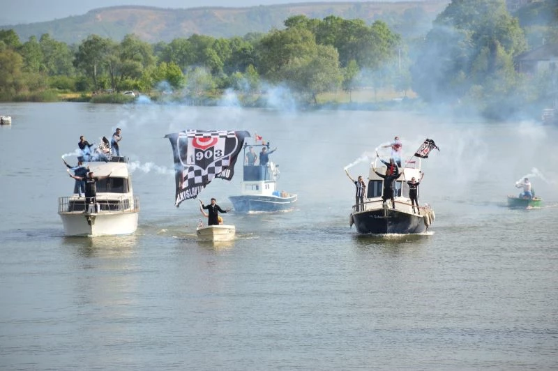 Göztepe’yi 2-1 mağlup eden Beşiktaş’ın şampiyon olmasının ardından ülke genelinde olduğu gibi Sakarya’nın Karasu ilçesinde de kutlamalar sürüyor. Karasulu bir grup taraftar, Beşiktaş bayrakları ve meşalelerle Sakarya Nehri’nde adeta şampiyonluk turu attı.