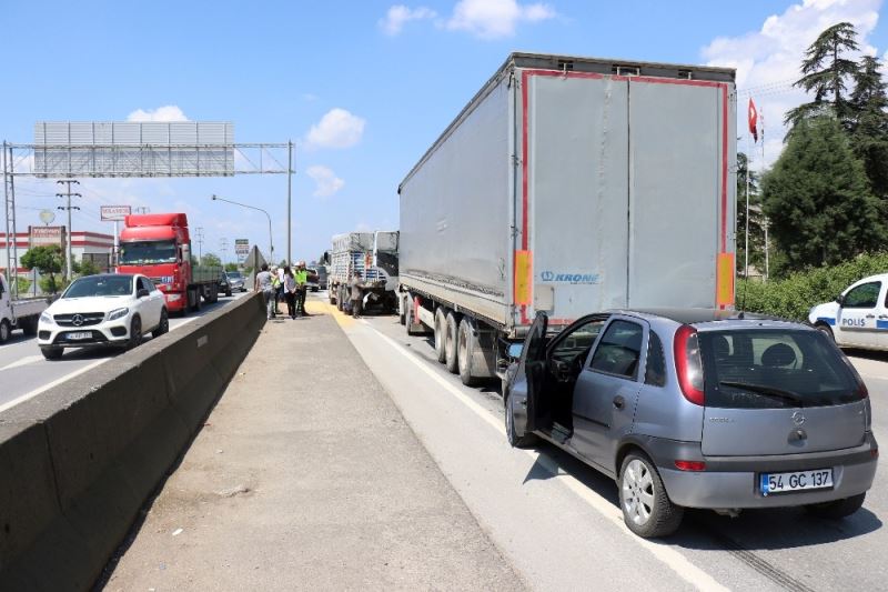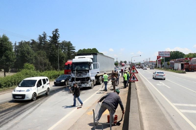 Sakarya’nın Erenler ilçesi D-100 karayolunda biri kamyon biri tır olmak üzere toplam 5 aracın karıştığı zincirleme trafik kazasında kilometrelerce kuyruk oluşurken, kazaya karışan kamyon sürücüsü yola savrulan mısırlarını toplamaya çalıştı.