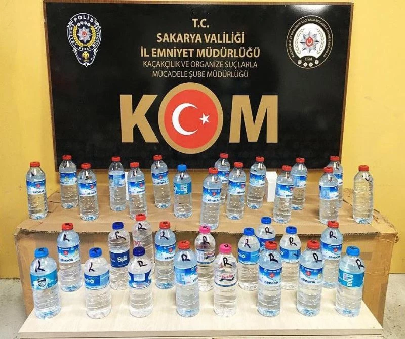 Sakarya’da polis ekiplerince 1 iş yeri ve 1 araçta yapılan aramalarda satışa hazır pet su şişelerine doldurulmuş 33 adet toplamda 16 buçuk litre kaçak alkol ele geçirildi.